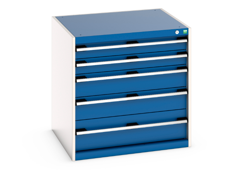 Cubio drawer cabinet with 5 drawers. Featuring a heavy duty, reinforced steel housing with up to 1 tonne total capacity and 100% extension drawers. Drawer configuration: 2x 100mm, 2x 150mm, 1x 200mm (75kg U. D. L. ). Finished in durable powder coat paint in RAL 7035 light grey / RAL 5010 gentian blue. WxDxH: 800x750x800mm.