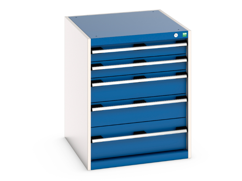 5 Drawer Steel Cabinet. Featuring a heavy duty, reinforced steel housing with up to 1 tonne total capacity and 100% extension drawers. Drawer configuration: 2x 100mm, 2x 150mm, 1x 200mm (75kg U. D. L. ). Finished in durable powder coat paint in RAL 7035 light grey / RAL 5010 gentian blue. WxDxH: 650x750x800mm.