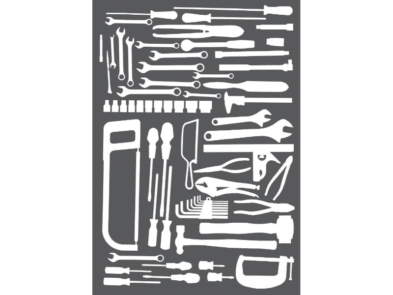 Vinyl overlay for engineering tools. Self adhesive tool shapes for use with perfo panels, aids quick and easy identification of storage position or missing tools. Cut out and apply to panel as required. Colour: White. WxDxH: 990x457x2mm