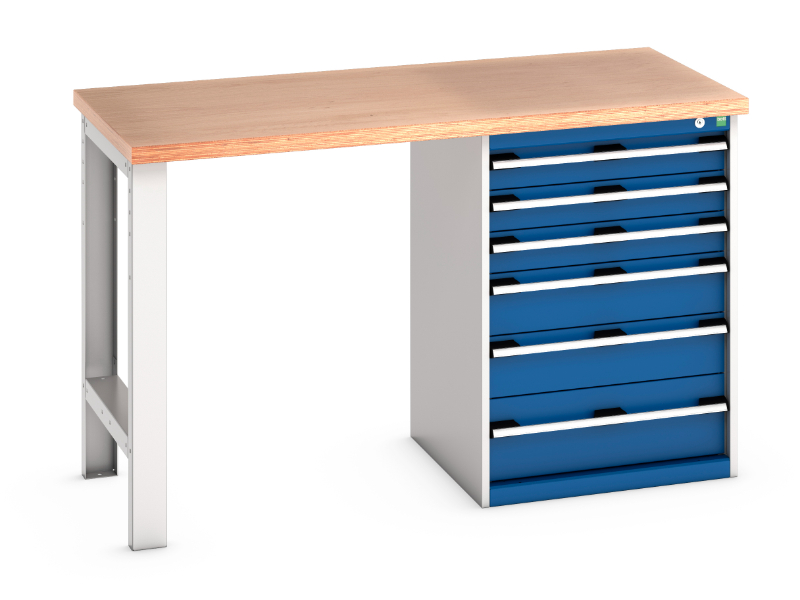 Cubio pedestal bench with 6 drawer cabinet. Featuring a robust, steel channel pedestal leg, bott cubio cabinet and a 40mm multiplex wood worktop. Cabinet size – WxDxH: 650x650x900mm. Drawer configuration: 3x 100mm, 2x 150mm, 1x 200mm with 100% extension slides (75kg U. D. L. ). Finished in durable powder coat paint in RAL 7035 light grey / RAL 5010 gentian blue. WxDxH: 1500x750x940mm.