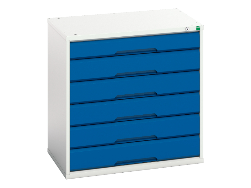 Verso drawer cabinet with 6 drawers. Featuring a robust, fully welded steel housing with 100% extension drawers. Drawer configuration: 1x 100mm, 5x 125mm (75kg U. D. L. ). Finished in durable powder coat paint in RAL 7035 light grey / RAL 5010 gentian blue. WxDxH: 800x550x800mm.