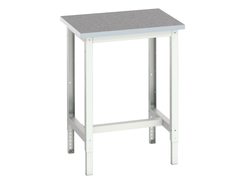 Verso adjustable height workstand. Featuring a robust steel channel, adjustable height framework with 30mm lino worktop. Optional storage units available. Finished in durable powder coat paint in RAL 7035 light grey. WxDxH: 700x600x780-930mm.