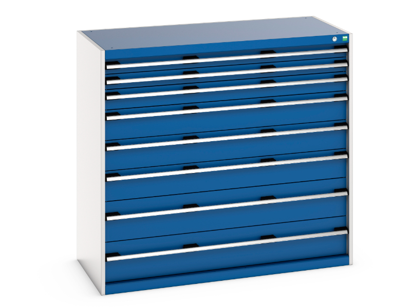 Cubio drawer cabinet with 8 drawers. Featuring a heavy duty, reinforced steel housing with up to 1 tonne total capacity and 100% extension drawers. Drawer configuration: 2x 75mm, 1x 100mm, 3x 150mm, 2x 200mm (75kg U. D. L. ). Finished in durable powder coat paint in RAL 7035 light grey / RAL 5010 gentian blue. WxDxH: 1300x650x1200mm.