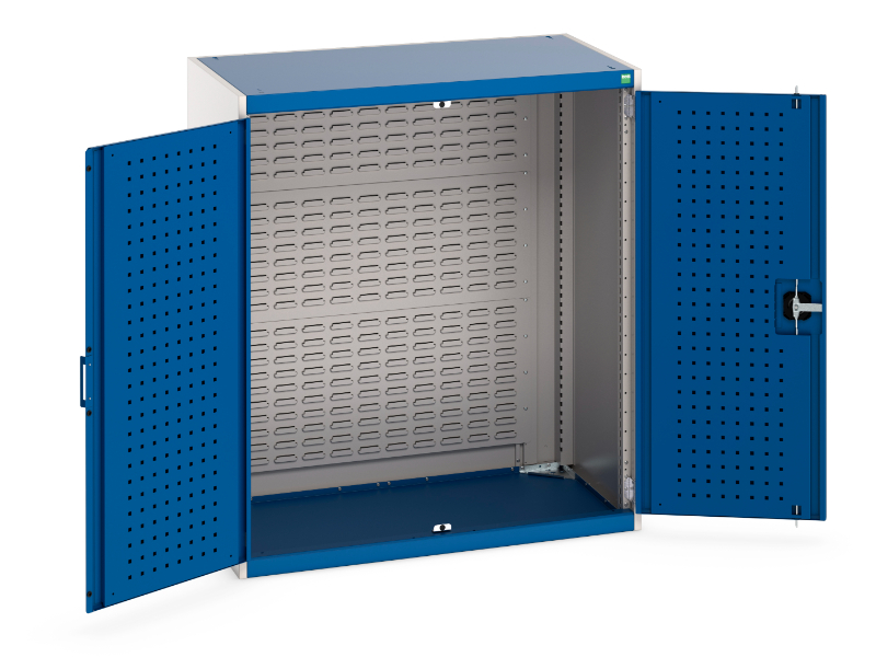 Cubio panel cupboard. Featuring a heavy duty, reinforced steel housing with up to 1 tonne total capacity with double, louvre panel lined, reinforced doors with louvre backpanel. Finished in durable powder coat paint in RAL 7035 light grey / RAL 5010 gentian blue. WxDxH: 1050x650x1200mm