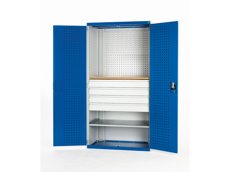 Cubio mini workshop cupboard. Featuring a heavy duty, reinforced steel housing with up to 1 tonne total capacity with double, perfo panel lined, reinforced doors with 1 adjustable height, galvanised steel shelf (160kg U. D. L. ), a multiplex worktop / shelf, 1x perfo, 1x louvre backpanels, and 4x 125mm drawers with 100% extension slides (75kg U. D. L. ). Finished in durable powder coat paint in RAL 7035 light grey / RAL 5010 gentian blue. WxDxH: 1300x650x2000mm.