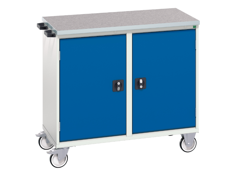 Verso maintenance trolley with double cupboard & lino top. Featuring a robust, fully welded steel housing with double, independent, storage sections, push – pull handles and 125mm diameter castors. Double cupboard section with twin, reinforced, doors and 2 galvanised steel shelves (75kg U. D. L. per shelf. Finished in durable powder coat paint in RAL 7035 light grey / RAL 5010 gentian blue. WxDxH: 1050x600x980mm