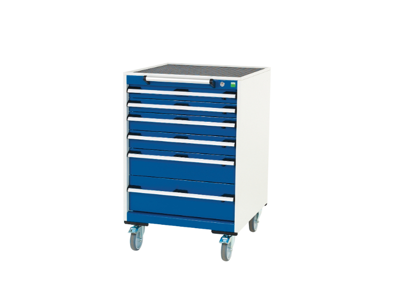 Cubio mobile drawer cabinet with 6 drawers & top tray with mat. Featuring a heavy duty, reinforced steel housing with push – pull handle, 100% extension drawers with drawer blocking and 125mm diameter castors. Drawer configuration: 2x 75mm, 2x 100mm, 1x 150mm, 1x 200mm (50kg U. D. L. ). Finished in durable powder coat paint in RAL 7035 light grey / RAL 5010 gentian blue. WxDxH: 650x650x985mm