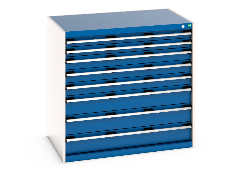 Metal Drawer Units with 8 drawers. Featuring a heavy duty, reinforced steel housing with up to 1 tonne total capacity and 100% extension drawers. Drawer configuration: 2x 75mm, 3x 100mm, 3x 150mm (75kg U. D. L. ). Finished in durable powder coat paint in RAL 7035 light grey / RAL 5010 gentian blue. WxDxH: 1050x750x1000mm.
