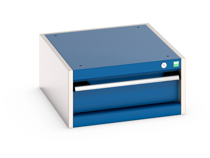 Cubio drawer cabinet with 1 drawer. Featuring a heavy duty, reinforced steel housing with up to 1 tonne total capacity and 100% extension drawers. Drawer configuration: 1x 150mm (75kg U. D. L. ). Finished in durable powder coat paint in RAL 7035 light grey / RAL 5010 gentian blue. WxDxH: 525x650x250mm.