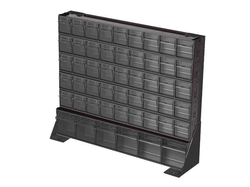 Tilt box bench stand kit 51 compartment. High impact polystyrol housings with transparent K-resin tiltable compartments for high capacity, easily visible storage. Includes label strip, may be clipped together vertically. supplied with a steel bench stand. Colour: Anthracite grey.