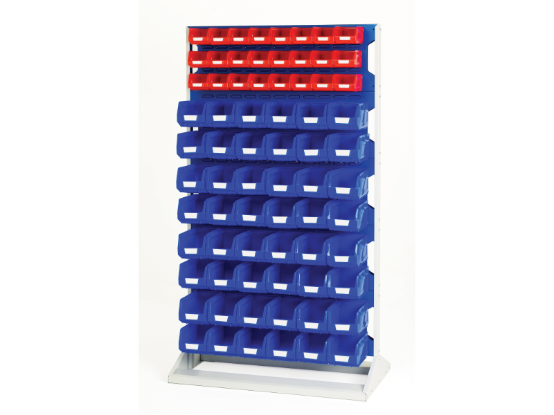 Louvre panel rack (double sided). Robust steel construction, with wide stable base and panels to both sides. Consists of 10 panels and 48x red 96x blue bins. Finished in durable powder coat paint in RAL 7035 light grey / RAL 5010 gentian blue. WxDxH: 1000x550x1775mm
