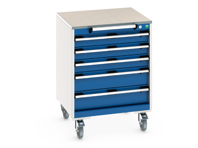 Cubio mobile drawer cabinet with 5 drawers & lino worktop. Featuring a heavy duty, reinforced steel housing with push – pull handle, 100% extension drawers with drawer blocking and 125mm diameter castors. Drawer configuration: 3x 100mm, 2x 150mm (50kg U. D. L. ). Finished in durable powder coat paint in RAL 7035 light grey / RAL 5010 gentian blue. WxDxH: 650x650x790mm