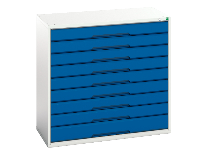 Verso drawer cabinet with 9 drawers. Featuring a robust, fully welded steel housing with 100% extension drawers. Drawer configuration: 8x 100mm, 1x 125mm (75kg U. D. L. ). Finished in durable powder coat paint in RAL 7035 light grey / RAL 5010 gentian blue. WxDxH: 1050x550x1000mm.