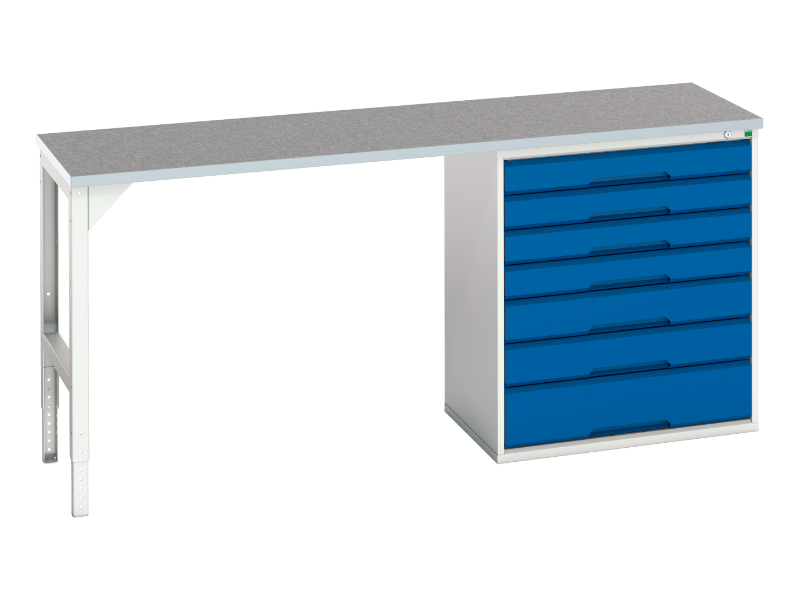 Verso pedestal bench with 7 drawer cabinet. Featuring a robust, steel channel pedestal leg, bott verso cabinet and a 30mm lino worktop. Cabinet size – WxDxH: 800x550x900mm. Drawer configuration: 4x 100mm, 2x 125mm, 1x 175mm with 100% extension slides (75kg U. D. L. ). Finished in durable powder coat paint in RAL 7035 light grey / RAL 5010 gentian blue. WxDxH: 2000x600x930mm.