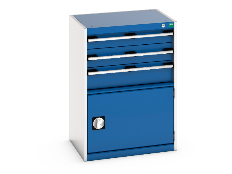 Cubio drawer cabinet with 3 drawers / cupboard. Featuring a heavy duty, reinforced steel housing with up to 1 tonne total capacity and 100% extension drawers. Drawer configuration: 1x 100mm, 1x 125mm, 1x 150mm (75kg U. D. L. ). Cupboard section has single, perfo lined door and 1 galvanised steel shelf (75kg U. D. L. ). Finished in durable powder coat paint in RAL 7035 light grey / RAL 5010 gentian blue. WxDxH: 650x525x900mm.